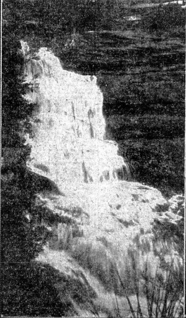 Two miles from the terminus of the Manly - Brookvale tram. On the opening of the tram to Narrabeen today the falls will be brought within easy walk of the terminus. These falls, which are little known to the average residents of Sydney, are among the most beautiful scenes to be found in this part of the State. The upper fall is about 200ft crashing into a deep valley, to which access is extremely difficult. The bottom falls continue in a series of cascades, thence continuing over rugged country to Narrabeen Lake.