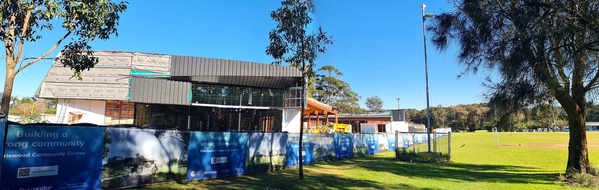 Council states Construction of the new Warriewood Community Centre is progressing well. Despite some recent weather delays, roofing is nearing completion, and work on external cladding, window framing and glazing is underway. Once the building is weather-tight, internal services and fitout will ramp up.