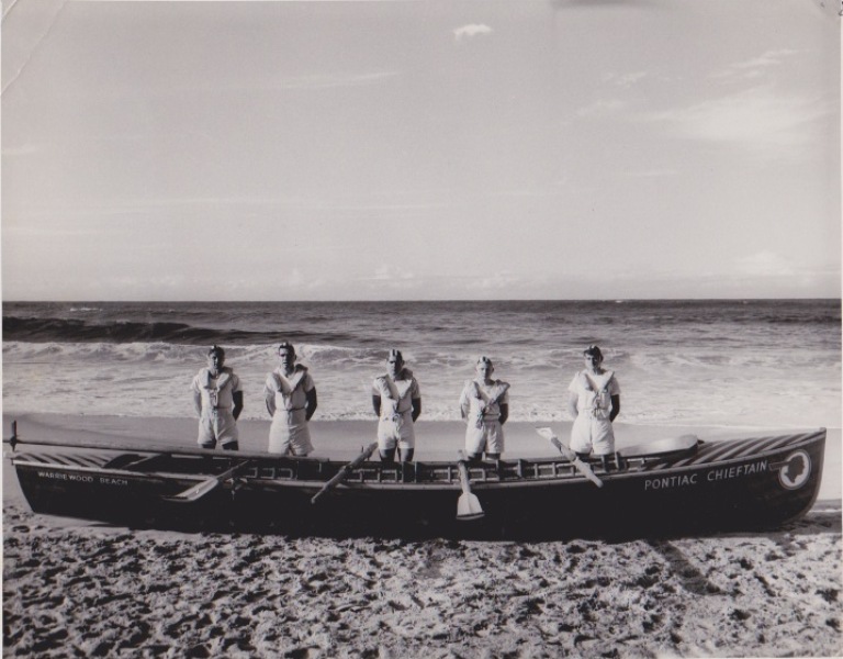 Warriewood SLSC has always had a strong representation in surf boats, winning many inter-club and championship races during its 70+ years. In 1956 the club won a new surfboat, the Pontiac Chieftain, which the Loreat SLSC in Western Australia purchased from them for £400 in 1958 as their first surf boat. The Pontiac Chieftain was also an automobile produced by the Pontiac Motors Division of General Motors from 1949 to 1958. Chieftains were one of the first all new car designs to come to Pontiac in the post World War II years. The Chieftain logo became that of Warriewood SLSC and is still used today. This photo from a newspaper of then was taken at Warriewood: