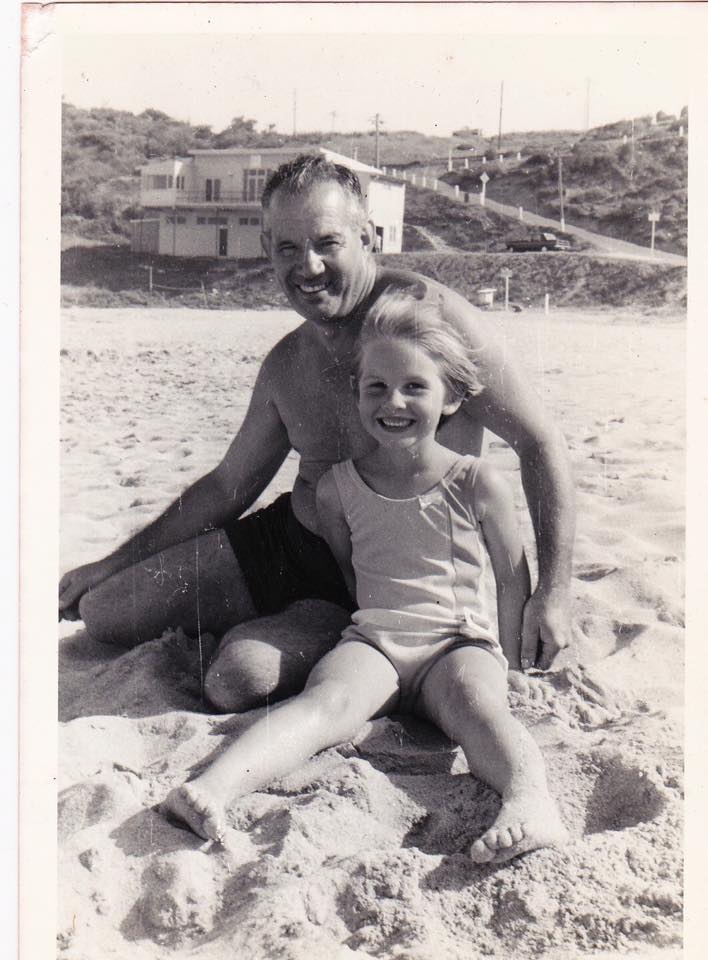 A great photo from Dianne Passlow of her and her Dad (Lionel Passlow) taken at Warriewood Beach around 1962 or 63. The old Warriewood surf club in the background.
