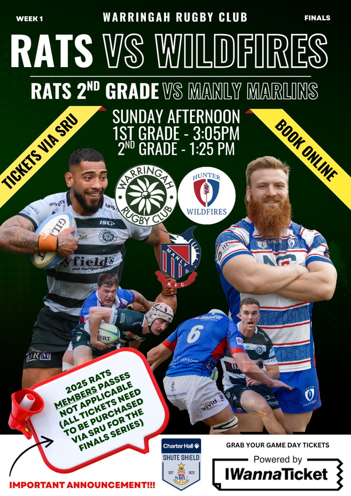 Rats First Grade and Second Grade at the home ground this afternoon - August 17 - NB: you need to be purchased via Shute Shield for the finals series. Head to shuteshield.rugby/tickets/pittwater-rugby-park to get yours