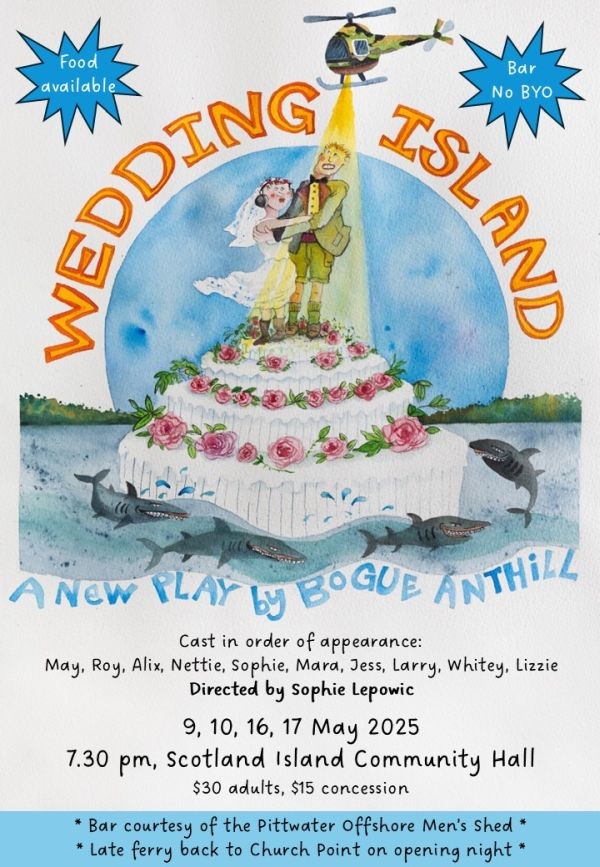 If you haven't yet seen the play then it's not too late. The run continues this coming weekend, Friday 16 & Saturday 17 May. The venue is Scotland Island Community Hall, and there's a bar provided by the Pittwater Offshore Men's Shed. There's even free food! For full details and to buy tickets, click here.