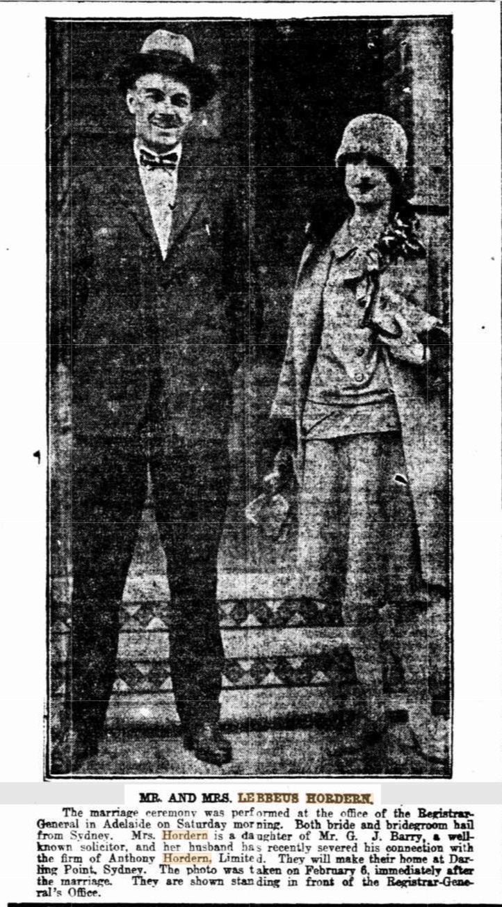 Mrs. Olga Hordern, first wife of the late Lebbeus Hordern, has returned to Sydney on business connected with the estate, and is staying at 52 Macleay Street. Mrs. Monle, her mother, who has been through great trials, having lost two sons at the war, and her husband soon after, is very glad to have her elder daughter back. Young Lebbeus is being educated in Paris, and like his cousin Samuel (only son of Sir Samuel), he Is destined to absorb as much culture as possible. Anthony Hordern's only son, young Anthony, is also being brought np on the same lines. Sydney’s Social Sids. (1928, November 24). Leader (Orange, NSW : 1899 - 1945), p. 3 (The Leader Sporting Weekly Edition). Retrieved, from http://nla.gov.au/nla.news-article254505112