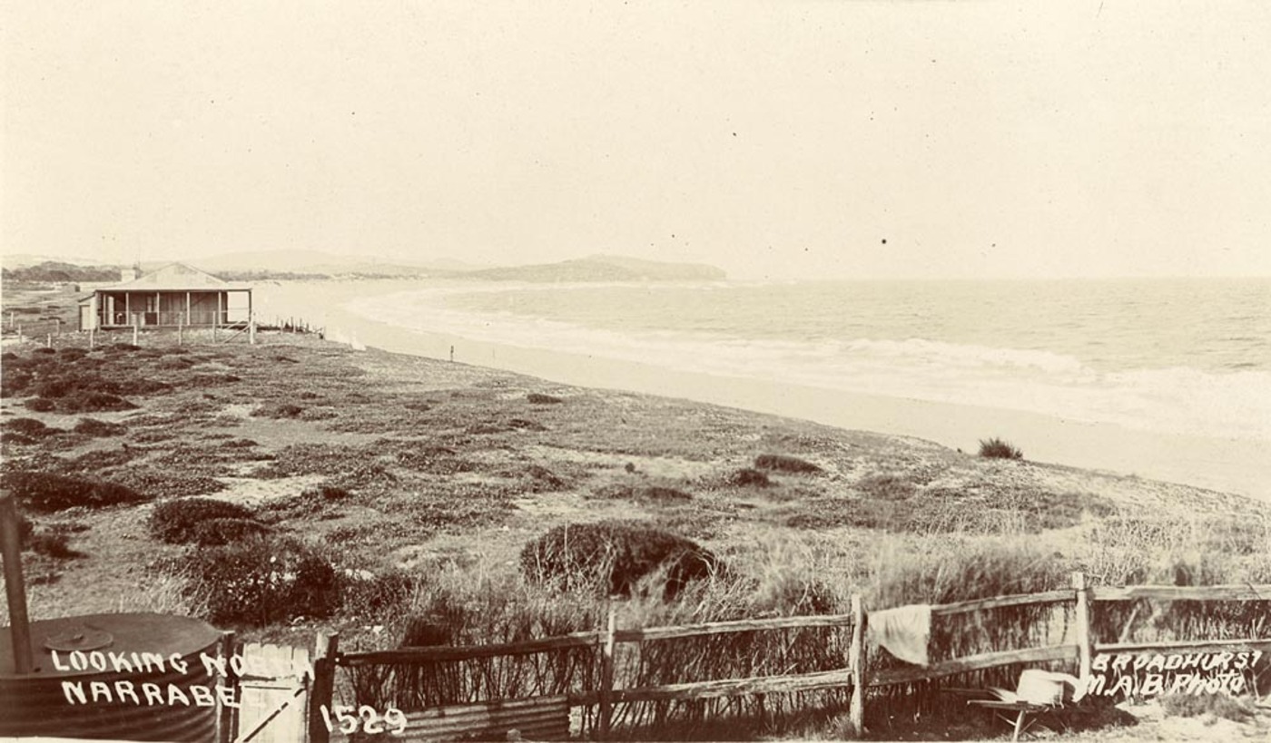 The first Macken Summer shack at Collaroy - Looking north to Narrabeen, From Scenes of Narrabeen album, circa. 1900-1927 Sydney & Ashfield : Broadhurst Post Card, Images No.: a106058h and below; a105160h courtesy State Library of NSW