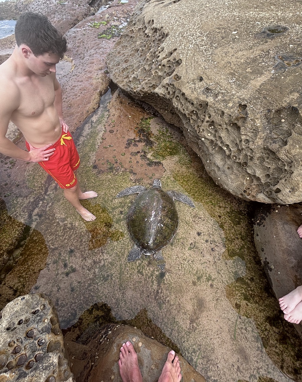 The turtle was too heavy for the lifesavers to move over the rocks, so they called the rescue into the State Operations Centre and NSW National Parks and Wildlife was able to respond to assist.