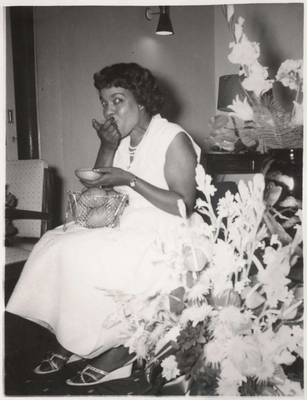 (1950-1955). Photograph of Winifred Atwell enjoying a mango [1] Retrieved from http://nla.gov.au/nla.obj-144631019