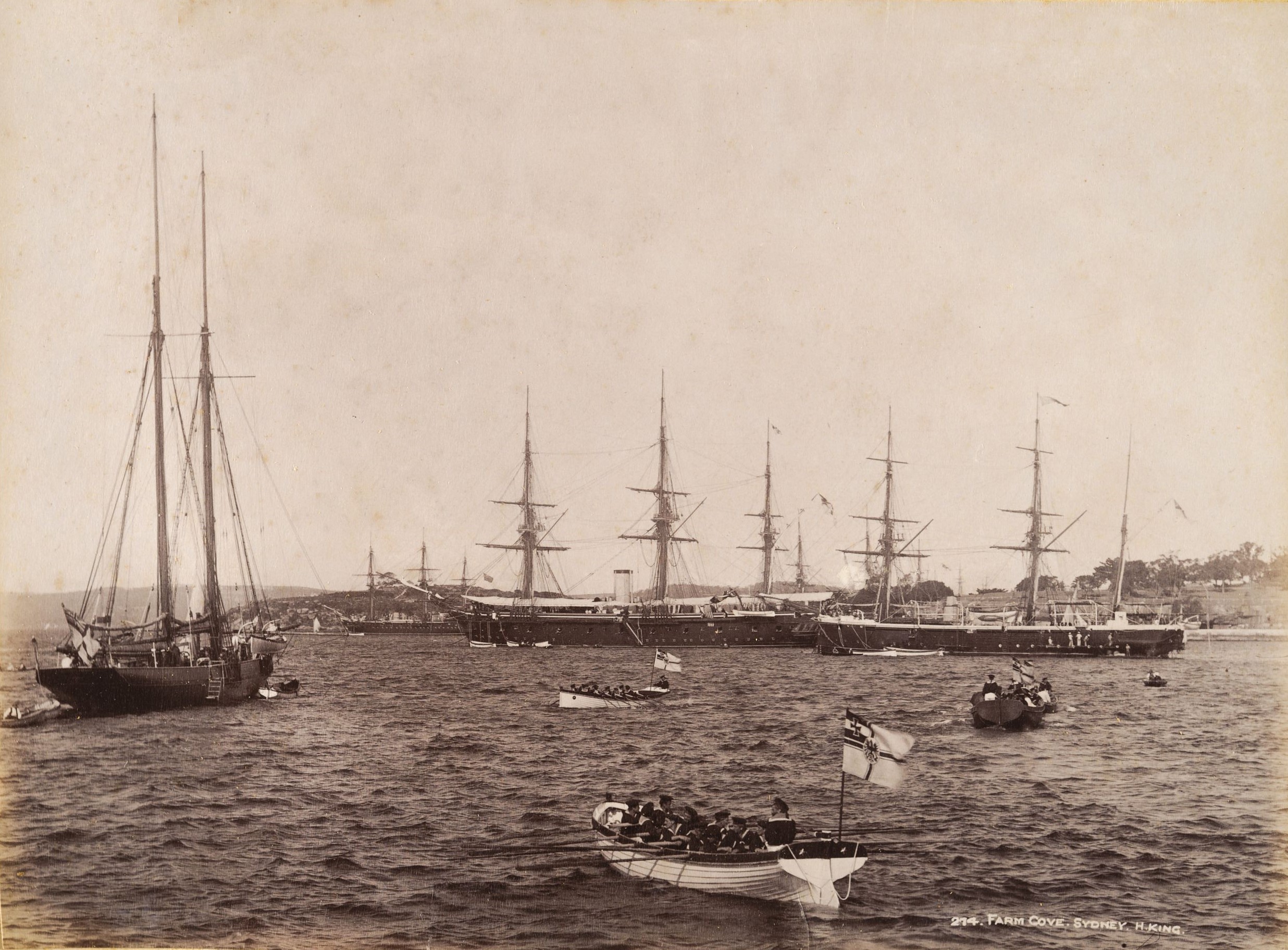 Photo to left: AWM: "SYDNEY, NSW. C.1880. SHIPS OF THE ROYAL NAVY'S SQUADRON ON THE AUSTRALIA STATION MOORED IN FARM COVE. (LEFT TO RIGHT) SCREW SLOOP HMS EGERIA, SCREW CORVETTE HMS RAPID, SCREW SLOOP HMS ALERT, SCREW CORVETTES HMS OPAL AND CALLIOPE. THE PHOTOGRAPH WAS TAKEN FROM FORT DENISON".