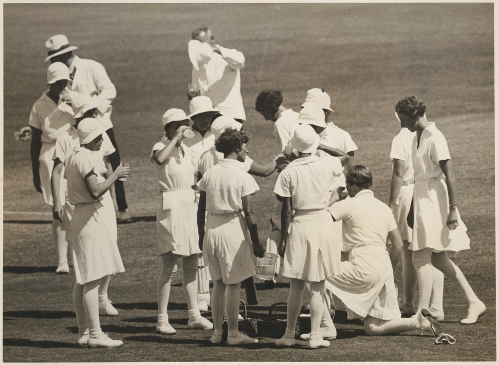 Above: nla.pic-vn3255988 Anne Palmer (NSW) bowled, with Spear, Snowball and Partridge (England), 2nd Women's Test match in Sydney (SCG) 1935. Below: Drinks Break.