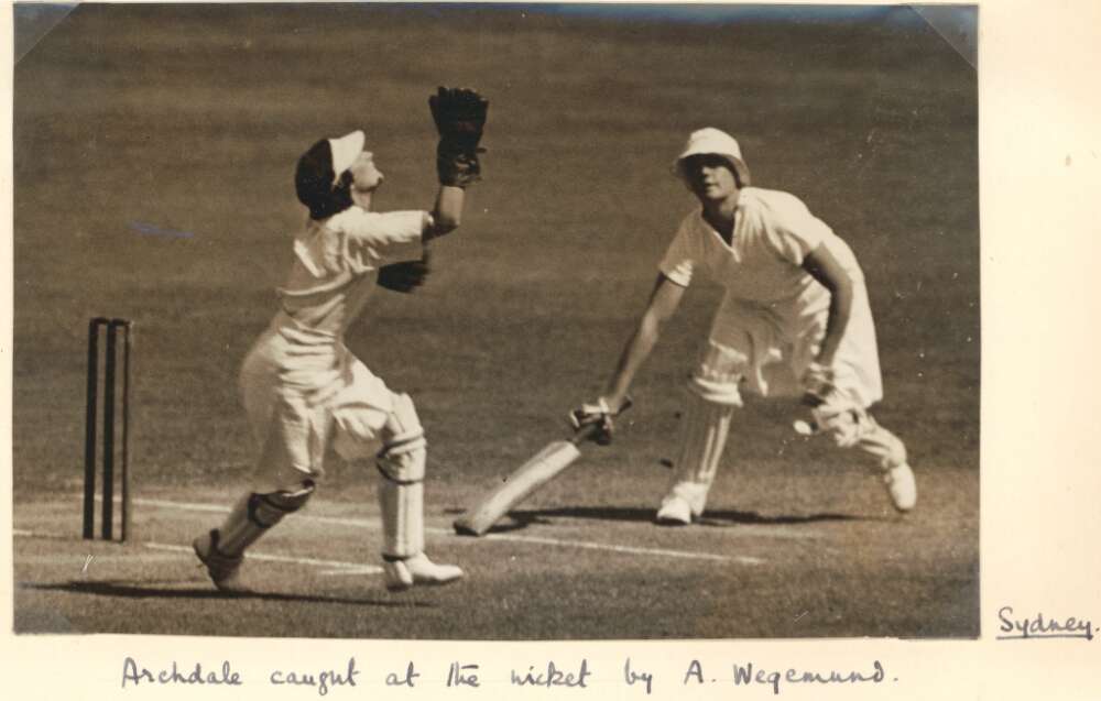 Women's Cricket Association. (1935). Archdale (England captain) caught at the wicket by Alice Wegemund (NSW), Sydney 1935 Retrieved from http://nla.gov.au/nla.obj-148696846