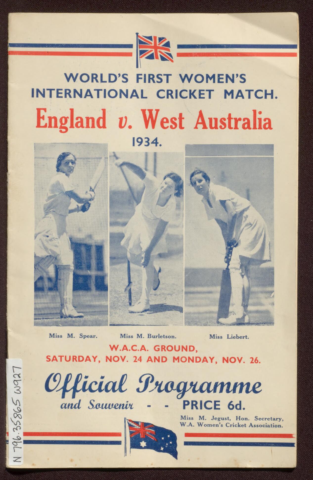 Western Australian Women's Cricket Association. (1934). World's first women's international cricket match : England v. West Australia 1934 : official programme and souvenir Retrieved from http://nla.gov.au/nla.obj-2363109643