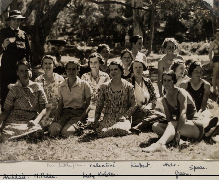 Below: Surf-bathing picnic at Palm Beach, Sydney, English and Australian cricket team, December 1935 Part of Women's Cricket Association tour of Australia, 1934-1935 [picture] Left to right: Mrs Waldron (Australian), Betty Archdale, M. Peden (Australian), Mrs Littlejohn (Australian), Valentine, Lady Walder, Liebert, Hide, Green, Spear. nla.pic-vn3257347