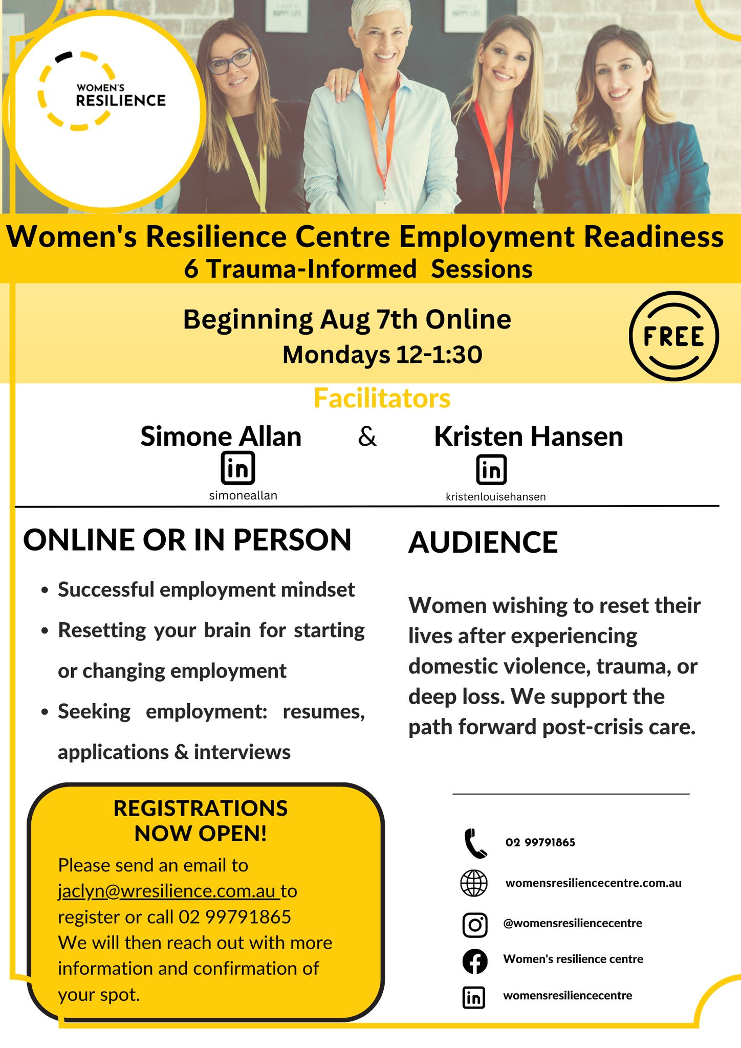 Employment Readiness starts online on 7th August on Mondays 12:00pm -1:30pm. Please email jaclyn@wresilience.com.au to register or call 9979 1865 for more information.