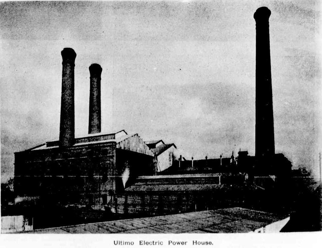 Recently large additions have been made to the tramway electric 'power house' at Ultimo, and also to the plant. Our illustration shows the buildings as they now are. The additional plant consists' of 16 Babcock and Wilcox boilers, of £ 250 horse power each, and three 1500 Kilowatt three-phase alternators, of the General Electric Company's manufacture, driven direct by vertical compound Allis engines. The whole of the buildings were erected by the Railway Commissioners' staff. One striking piece of engineering work is the travelling crane. A railway is constructed near the roof at a height of 50ft; along this a traveller Weighing 70 tons runs longitudinally, and laterelly a travelling crane, capable of hoisting 30 tons, moves. The span of the traveller is …ft. It may be stated that the new generators are (lie largest south of the line, that 200 tons of coal is consumed daily, and that the pumping equipment lifts 9,000,000 gallons of sea water from Darling Harbour daily-not much below half the quantity of water consumed in the metropolitan area every day.