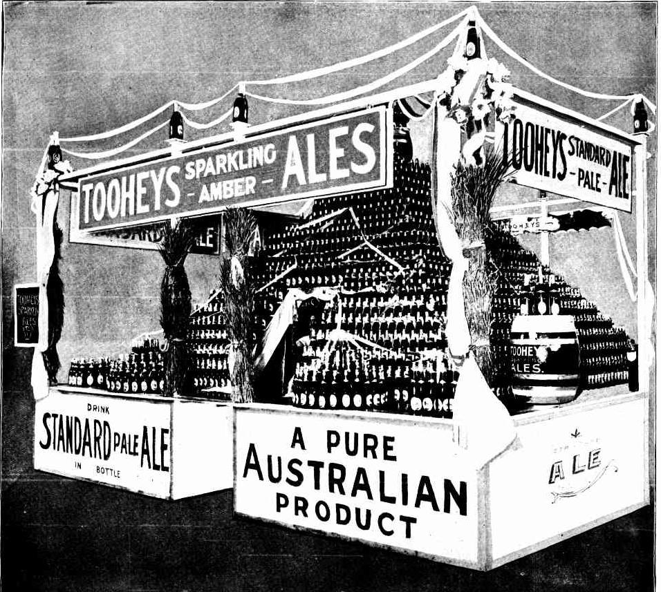Throughout the length and breadth of Australia 'Tooheys' is a household word. In fact, 'Here's too 'ee,' the motto adopted by the firm, has become a part of the 'Australian language.' That motto, with the fine figure of the brewery smith luxuriating in his glass of ale, adorns the big brewery building at Belmore Park, which is one of the most conspicuous features of that part of the city, and figure and toast also appear in the trophy of the brewery at the Exhibition, which is illustrated on this page. This trophy consists of the Standard Ales in cask and bottle, decorated with sheafs of barley. The Standard brewery stands right opposite the new central railway station and Belmore Park, an admirable situation for convenience and working, and it is full of the latest notions in machinery and appliances for the brewing of ales, stouts, and beer, and for the making of cordials. Yet, big as it is, it grew from very small beginnings. It is the outcome of the enterprise of the brothers John T. Toohey and James M. Toohey, both deceased, who about the year 1869 commenced operations in premises at Darling Harbour. The growth of the business has been phenomenal, and the floating of the concern into a limited liability company in 1902, with a capital of £550,000, is only one of many indications of rapid progress which occur in the history of the undertaking. At the present time the company employs quite a little army of workers day and night, and can supply its patrons with anything they may require in the shape of beer, porter, cordials, and mineral waters, all made on the premises, or with colonial and imported wines, spirits, and cigars of all descriptions. The malthouse is capable of treating upon the most approved pneumatic principles from 90,000 to 100,000 bushels of barley during the year, and this in itself is a tolerably good hint to our farmers who care to take it, that if they grow and put on the market a suitable malting barley, there will be one buyer at least willing to pay the local price, and to save the heavy duty imposed upon imported barley. The output of beer which necessitated a duplication of the plant some nine years ago again threatens to strain the means of manufacture, but, needless to say, every preparation is being made to cope with any and every possible increase in the demand. The very latest plant for bottling beers in vacuum has recently been installed, and in all departments from the brewing tower to the refrigerating rooms, and throughout the acres of stores, cellars, and stables, there is a thorough up-to-dateness in all details which foretells that the secret of success is known by those controlling the destinies of the brewery, and loyally worked for by all concerned. It is another example of well-ordered industry, of the application of the most scientific idea to the most practical purpose, and of the concentration of effort and utilisation of commonsense to a common end.