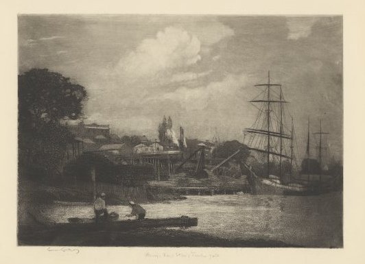 Eaton's timber yard, Berry's Bay, New South Wales, circa 1916 by Sir Lionel Lindsay. Image no: nla.pic-an10711203, courtesy National Library of Australia.