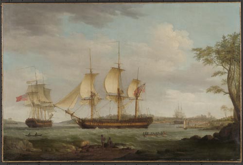 Right: Britannia, shown here leaving Sydney Cove, courtesy National Library of Australia, Reference: nla.pic-an2253068, Oil painting by Thomas Whitcombe