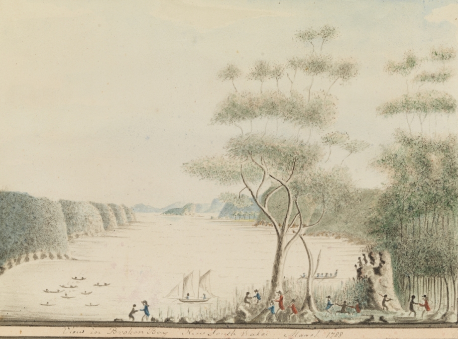'SW. Arm of Broken Bay New South Wales from an Island at the Entrance. Sepr 1789' by William Bradley - Drawings from his journal `A Voyage to New South Wales', 1802+ , Image No.:a3461014, courtesy State Library of New South Wales.