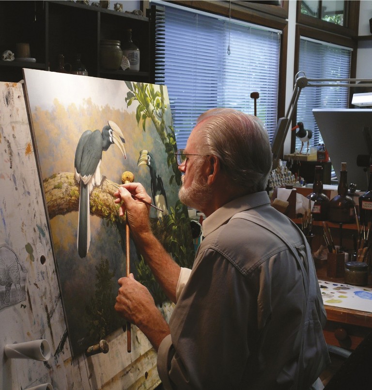 William T. Cooper working on a painting of Oriental Pied Hornbills (Anthracocerus albirostris), a Sumatran species, in his studio at Topaz, 2008. Photography by Wendy Cooper, page 222, of An Eye for Nature: The Life and Art of William T. Cooper