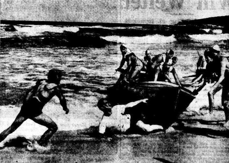 Typical of the hazards and thrills of surfing is this incident at a Maroubra Carnival. A member of the boat's crew has his foot caught under the boat during the beaching, and colleague rushes to his aid. Fresh Records Mark Best Season In Surfing. (1953, March 22).The Sunday Herald (Sydney, NSW : 1949 - 1953), p. 10 Section: Sports Section. Retrieved from http://nla.gov.au/nla.news-article18508937