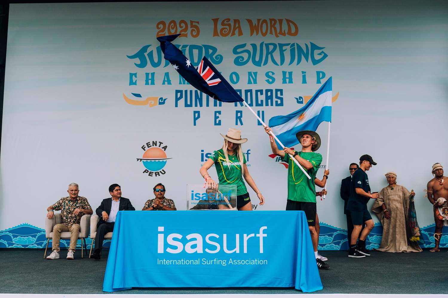The athletes gathered were represented on stage by Australian Team Captain Milla Coco Brown (AUS), who swore an oath of good sportsmanship alongside ISA Judge Jacqueline Silva. Also present on stage were National Director of Recreation and Promotion of Sport for the IPD, Jose Luis Casas, FENTA President, Elfri Alfonso Navarrete Narro, and ISA Vice Presidents, Karin Sierralta and Jean-Luc Arassus.