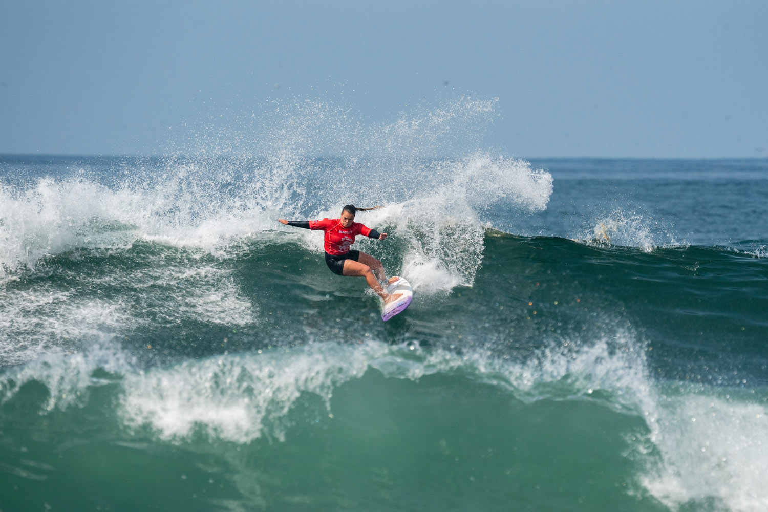Debuting in the U/18 girls division yesterday in her third ISA WJSC appearance, 14-year-old Miliani Simon (TAH) posted one of the highest single-wave scores of the round. Today, Simon claimed the first excellent score of the U/16 girls, an 8.00, for a critical backhand two-turn combo on a wave at least double overhead for her. Improving her placing each year so far, Simon is aiming to go much deeper in the event in 2025.