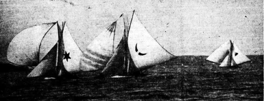 Caneebie, that had been giving Irex a great race for third place, had her mast blown clean away out of her; and the skipper of Vigilant, whose mast had been sprung in one of the squalls, played for safety at the Shark Island buoy, and instead of gibing, put his helm down. Whether the crew were taken by surprise, or there was some misunderstanding, the sheets were not brought in fast enough. The skipper of Bulletin saw his chance, and threw his boom over. It was an anxious moment when the boat heeled over, but she righted, and sped, with a good lead towards the flagship. On the beat to Fort Denison she drew out further from Vigilant, but all was not over yet. The two leaders, owing to shifts in the wind and a calm, changed places, and it was even money till the line was crossed by Bulletin to the accompaniment of the wildest cheering, a few: seconds only ahead.