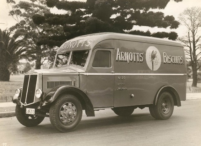 Arnott's flatbed trucks (nos. 17, built by C.Ibbotson, King St, Newtown, & 22) and van (no. 20, with sloping halved radiator), [ca. 1935-1940] / Milton Kent Digital Order No. a449002, Courtesy State Library of NSW Original vans were bright red from 1920’s, prior to then deliveries were made by horse and buggy outfits.