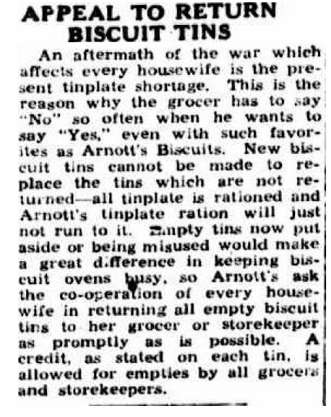APPEAL TO RETURN BISCUIT TINS. (1947, June 19). Barrier Miner (Broken Hill, NSW : 1888 - 1954), p. 3. Retrieved from http://nla.gov.au/nla.news-article48499604 Advertisements alike these appeared in every newspaper around the country up until 1947; there was a post-war tin shortage. Some sources state the tin shortage lasted well into the 1950's.