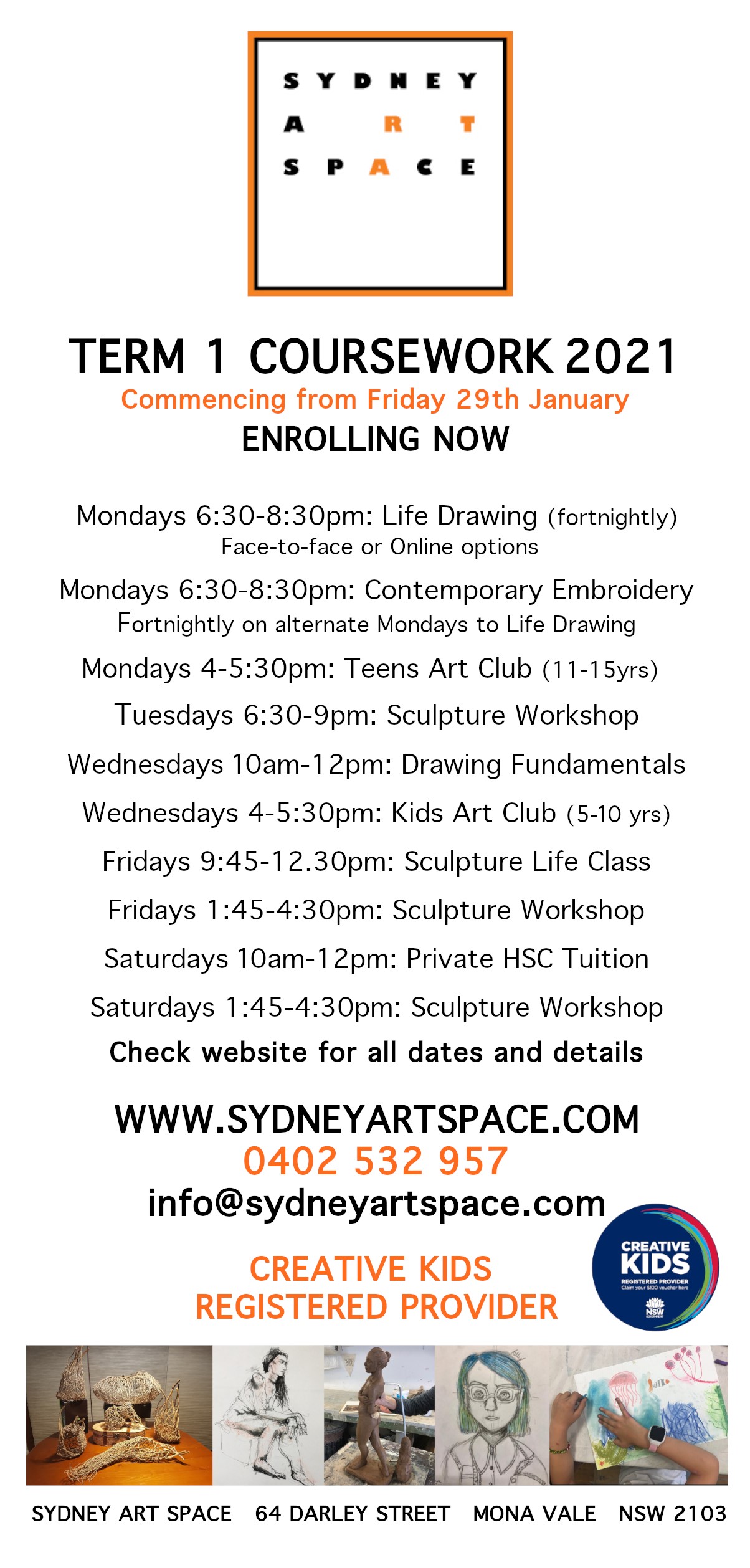 Sydney Art Space Term 1 courses start on January 29th 2021 and will be up on our website by December 14th 2020. Please see our flyer below and visit our website to explore what courses and enrolment options are available: www.sydneyartspace.com
