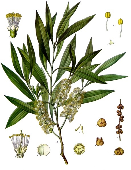 Right: Old illustration: Melaleuca_leucadendra from Franz Eugen Köhler, Köhler's Medizinal-Pflanzen, 1897.