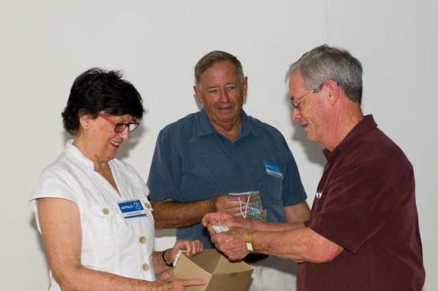 Getting ready for the lucky door prize, Trish Kalf, President Paul Purvis and Brian Hindes