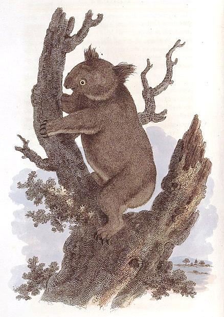 Image: T.L. Busby. Koalo. Plate from Perry, George, fl. 1810-1811. Arcana, or, The Museum of natural history : containing the most recent discovered objects embellished with coloured plates ... combining a general survey of nature. This 1810s engraving was the first or one of the first illustrations of Koalas published in Europe. NLA Picture: Pub;lished May 1810: http://nla.gov.au/nla.aus-vn1545543-1x