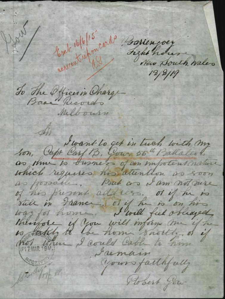 Mr. Fred Warren (late A. I.F.) eldest son of Mr. J. L. Warren, Chief Keeper Barrenjoey Lighthouse, is at present in Byron Bay on a holiday. He saw a long term of service., remaining in France for some Time as a member of the burying corps. LOCAL AND GENERAL,. (1920, February 28). The Byron Bay Record (NSW : 1902 - 1924), p. 8. Retrieved from http://nla.gov.au/nla.news-article108143343
