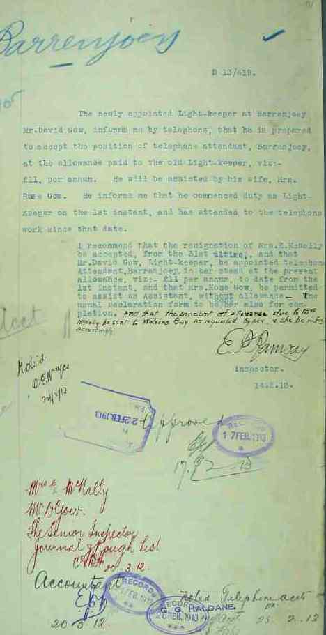 The gentleman who became Principal Light Keeper after Mr McNally was David Gow, and here too a whole family, including generations, back and forward in father Robert, were all on duty while on the Barrenjoey Headland. David Gow, elder brother of Carl Gow, commenced his duties on February 1st, 1912: