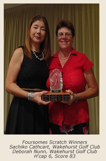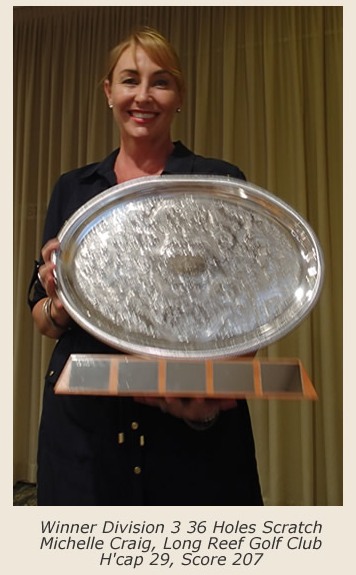 The major golf prize of the evening went to Jacqui Morgan of Monash Country Club who again took out the Division 1 36 Hole Scratch event with a winning score of 159 over the 2 days. Jacqui plays off a handicap of 0 and consistently wins major tournaments including the Barrenjoey Week of Golf for the past 3 years. Runner up from Avondale Golf Club, Pymble, was Sharon Thompson, also playing off a handicap of 0 and with a score of 160.