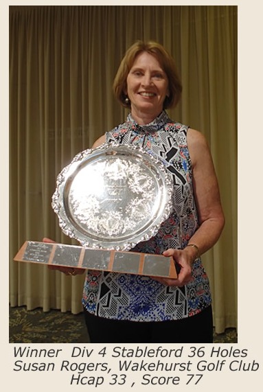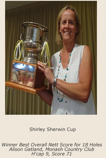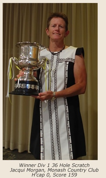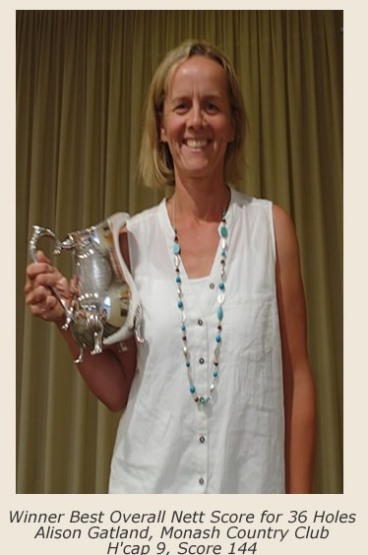 Division 1 36 Holes Nett Winner was Alison Gatland from Monash Country Club , Handicap 10 and 144 points Nett, and Division 1 36 Holes Nett Runner up was Lucy Sacco from Bayview Golf Club, handicap 4 and 152 Nett points.