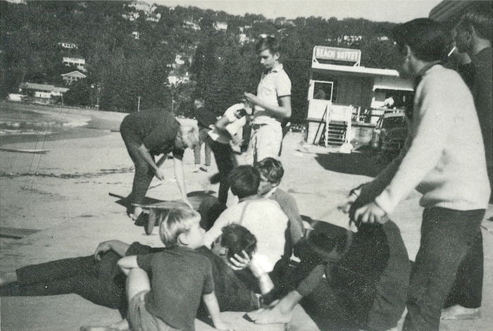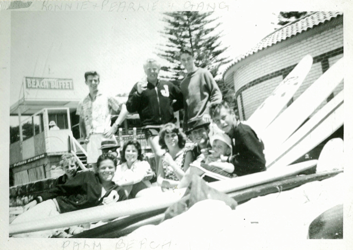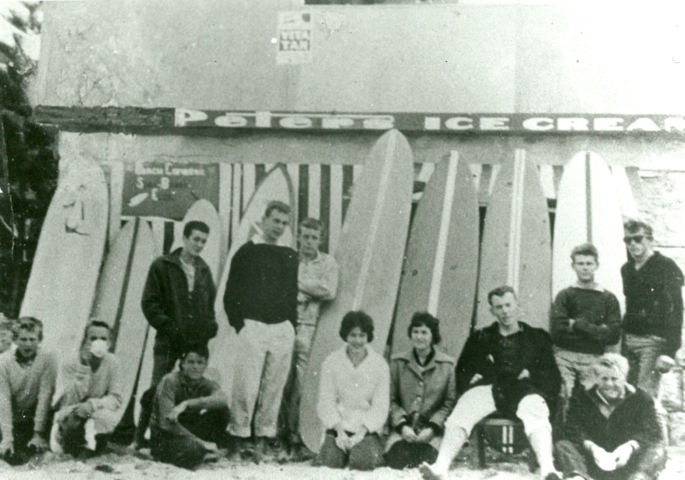 Some original Beachcombers Surfboard Riders Club Palm Beach NSW 1961 near the present day dressing sheds. Note Johnny Hawkes Beach Buffet in the background washed away in king tides. The Beachcomber’s Club was underneath the Beach Buffet. Back row – Ken ‘The Blue Streak’ Mackey, John ‘Pine’ Prosser, Richard Parkinson.
