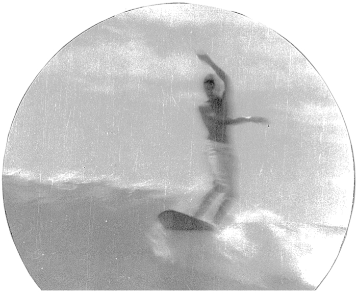 Ron Turton Palm Beach NSW Winter 1959. One of the guys had an underwater camera and used to take pictures of marine life. I was on this wave near the dressing sheds and up he popped in front of me and took this fuzzy photo! Evasive action required on this 9 footer!