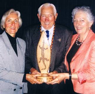 Right (In Text) with daughters Dianne and Christine after receiving Message Stick from the Budawang Tribe of Milton-Ulladulla; 'To the Guringai Tribe of the Northern Beaches', 2008.