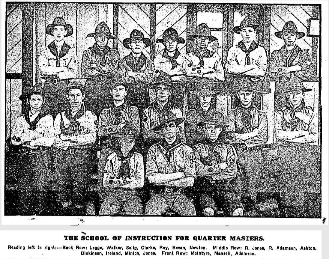 The following is the personnel of this Troop: Scoutmaster Foggon. No 1 Patrol; Leader A. Clarke, Corporal; F. Piggott, Scouts; J. Miller, C. Townshend, S. Grimes, H. Farr, and B. Carroll. No 2 Patrol; Leader; J. Skinner, Corporal; H. Forster, Scouts; N. Gritilin, A, Savage, C. Reilly, H. Hardy, J. McLaughlin and M. MacAuliffe. No 3 Patrol; Leader; C. Smith, Corporal; N. Lyons, Scouts; S. Turner, J. Bonner, F. Stewart, C. Bown, G. Todd and D. McLeod. No 4 Patrol; Leader; F. Dully, Corporal; B. McEwan, Scouts; R. Walker, M. Phillips, L. Bridge, J. Burnett, C. Gibbons and H. Dale. No 5 Patrol; Leader; A. Phillips, Corporal; L. Scully, Scouts; D. Doherty, M. Tomm, H. Macconi, B. Johnston, F. Roberts and B. Dunn. No 6. Patrol; Leader; G. Evans, Corporal; R. Goldsborough, Scouts; D. Evans, M. Goldsborough, Scouts; D. Evans, M. Goldsborough, R. Dart, J. Lawler, J. Travers, and M. Young. Scouts Luker V. Smith, G. Patrick, W. Charters, and W. Maddock are yet to be allotted to Patrols.