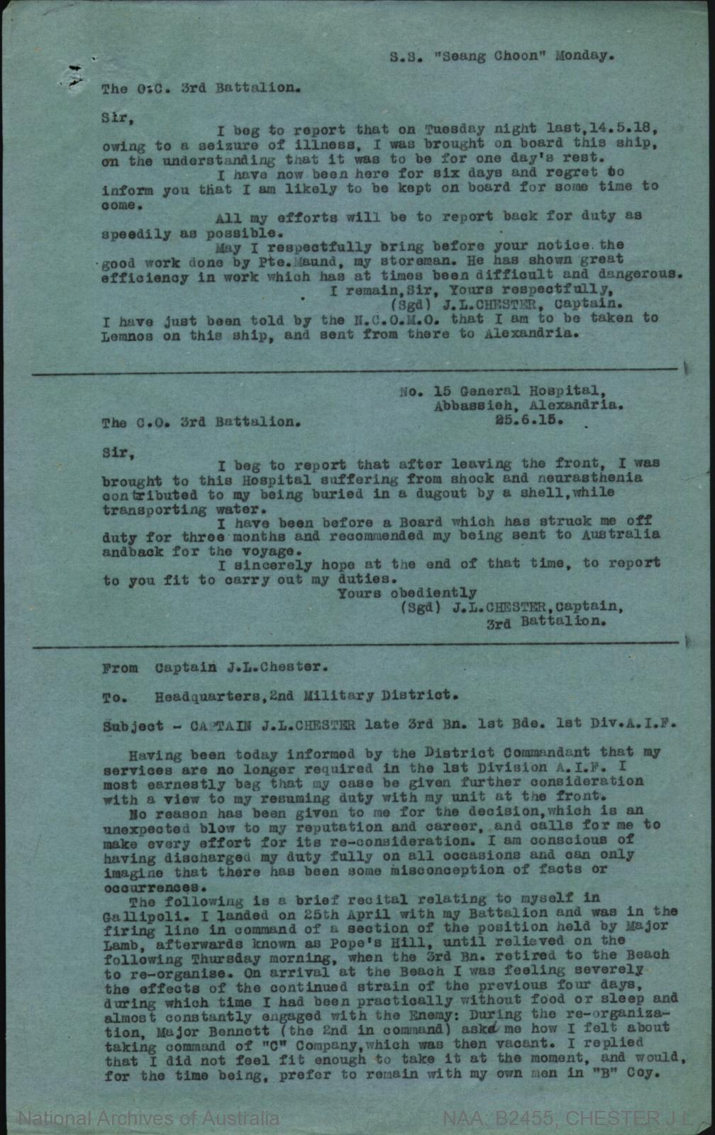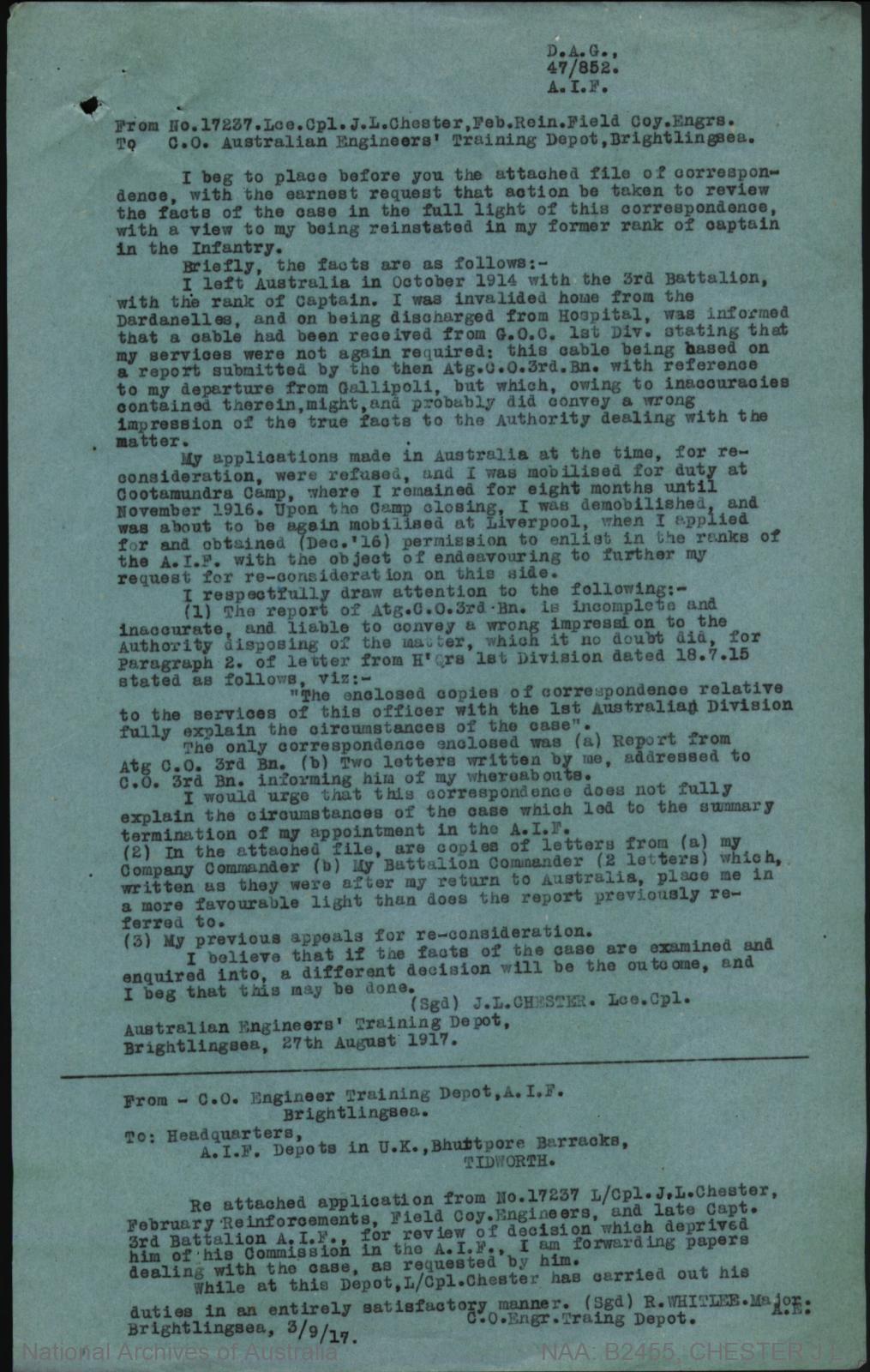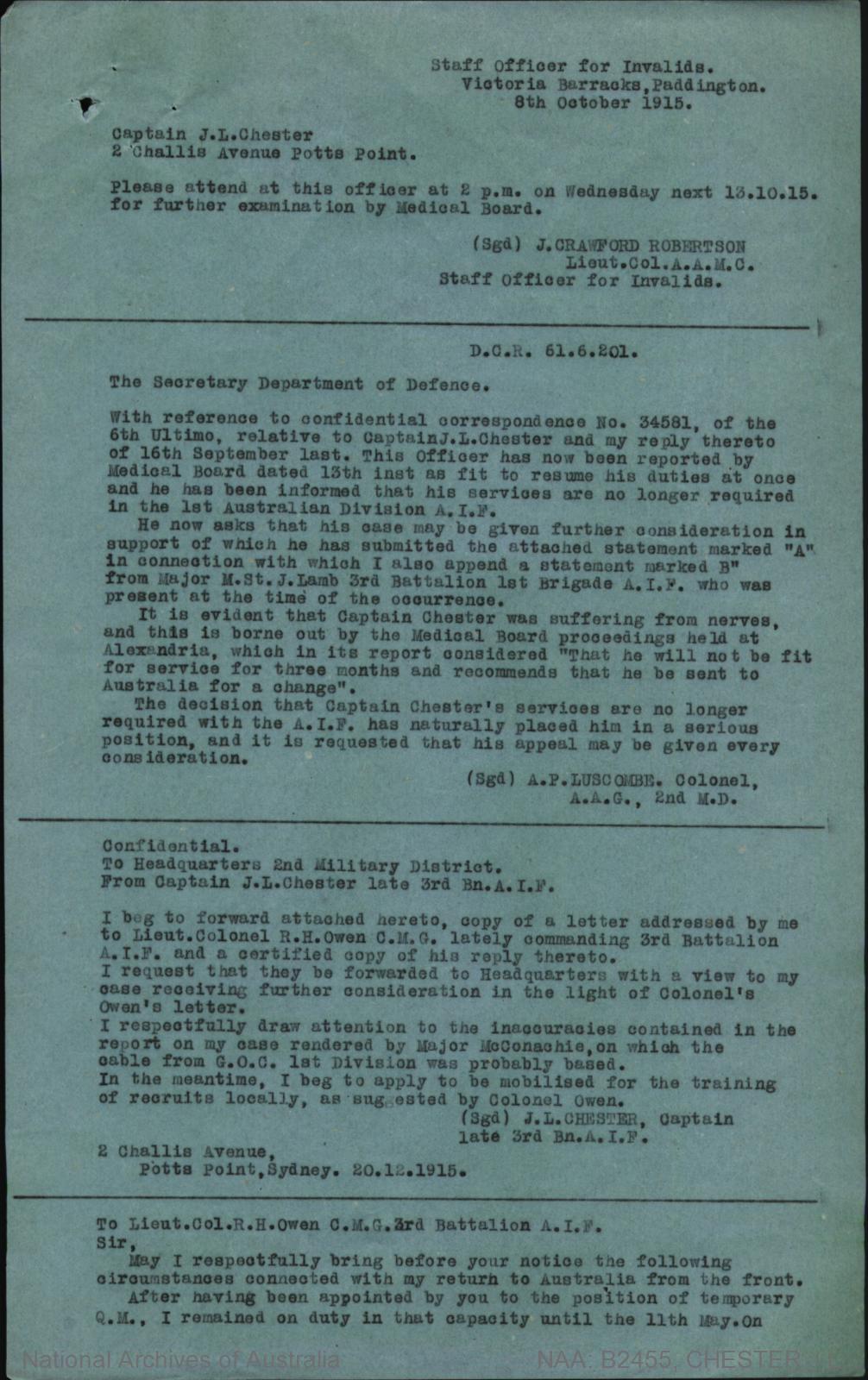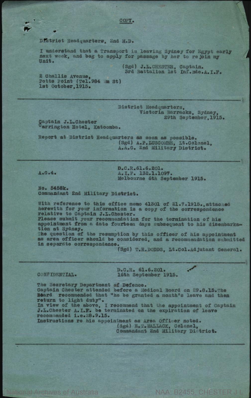 Lieutenant John Lewis Chester of the Australian Garrison Artillery was appointed to New South Wales area Number 17A for the region of Mosman with the rank of Lieutenant while holding Temporary Appointment as Area Officer. From: http://alh-research.tripod.com/Light_Horse/index.blog?topic_id=1105080