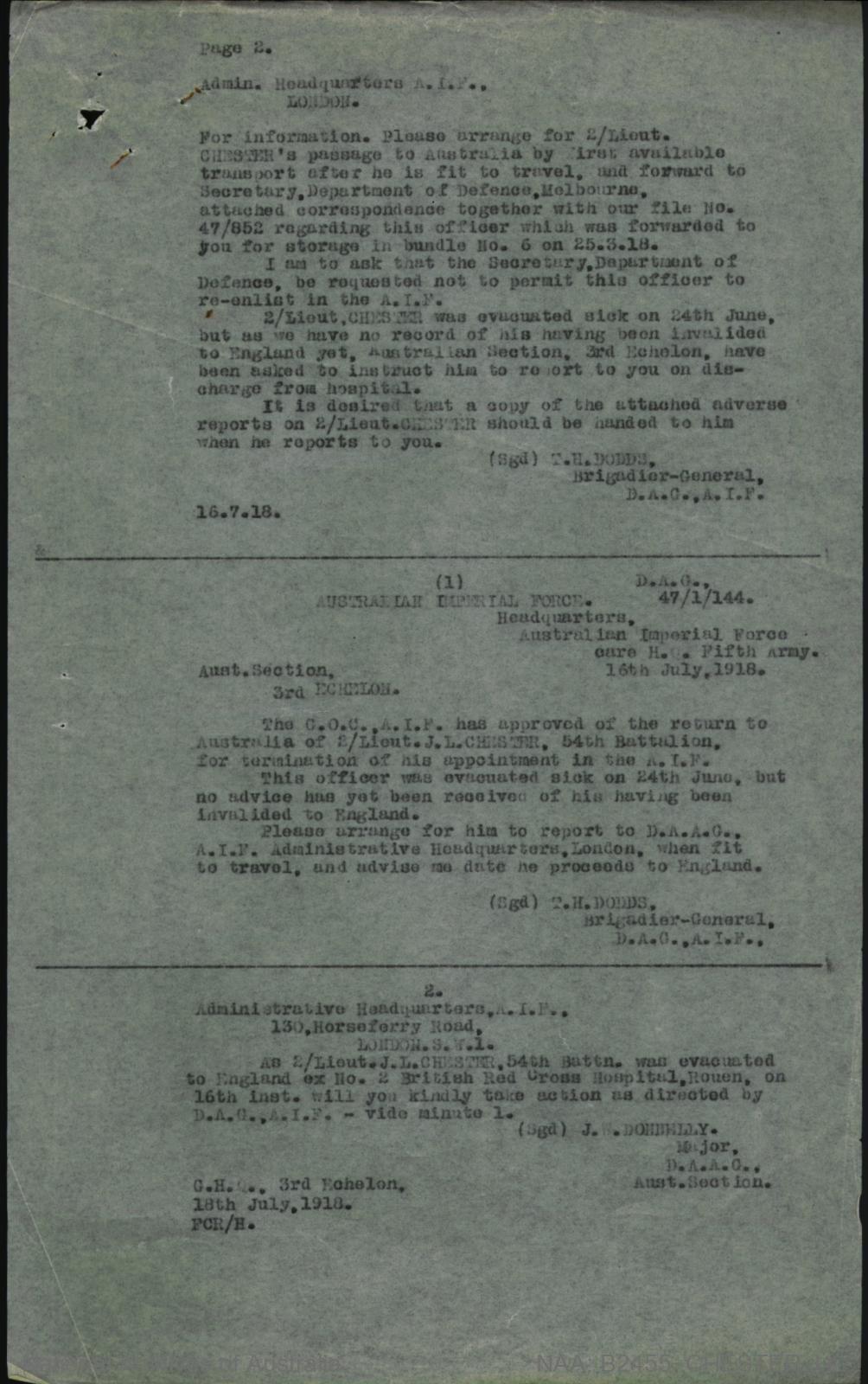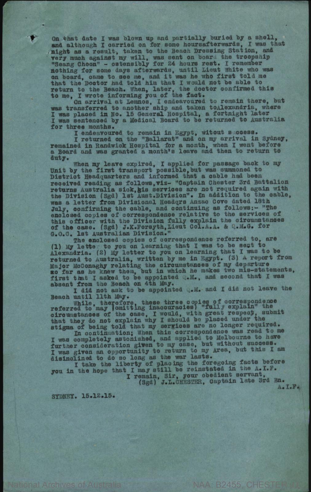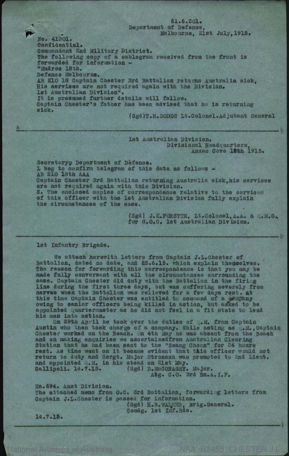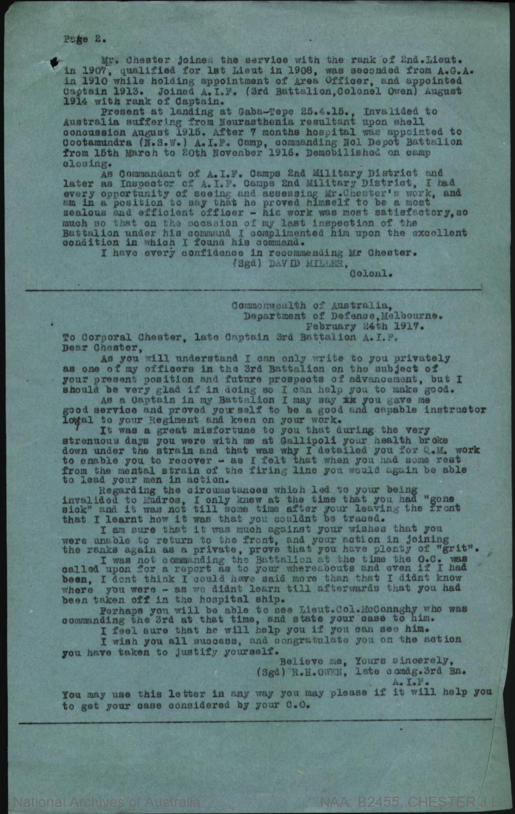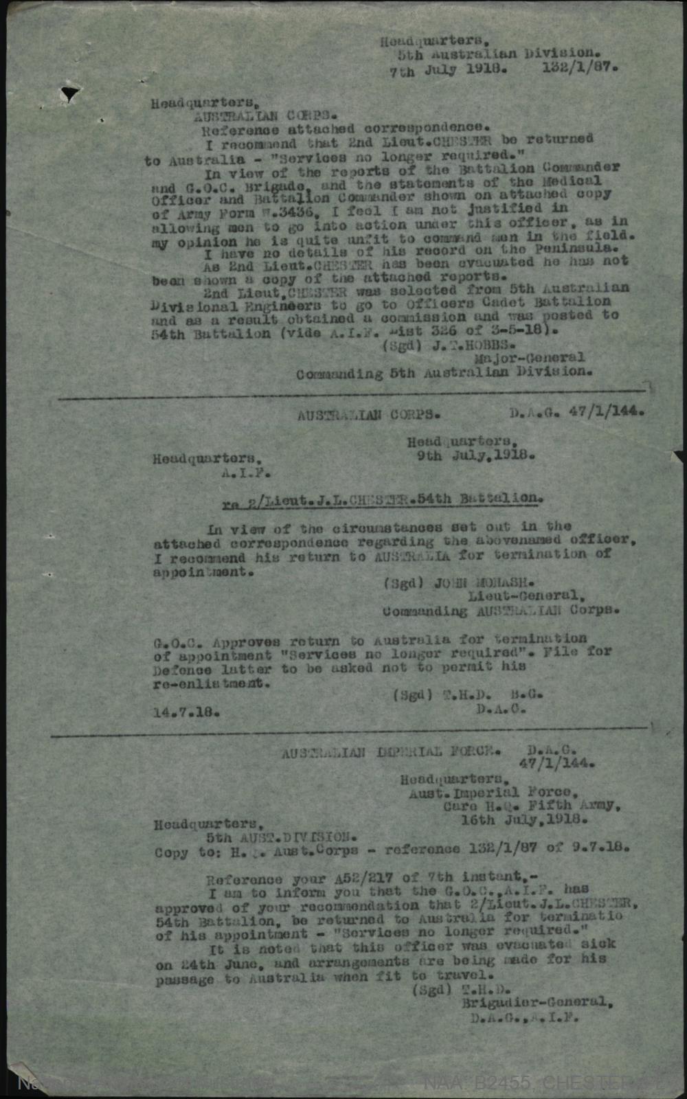 Lieutenant John Lewis Chester of the Australian Garrison Artillery was appointed to New South Wales area Number 17A for the region of Mosman with the rank of Lieutenant while holding Temporary Appointment as Area Officer. From: http://alh-research.tripod.com/Light_Horse/index.blog?topic_id=1105080