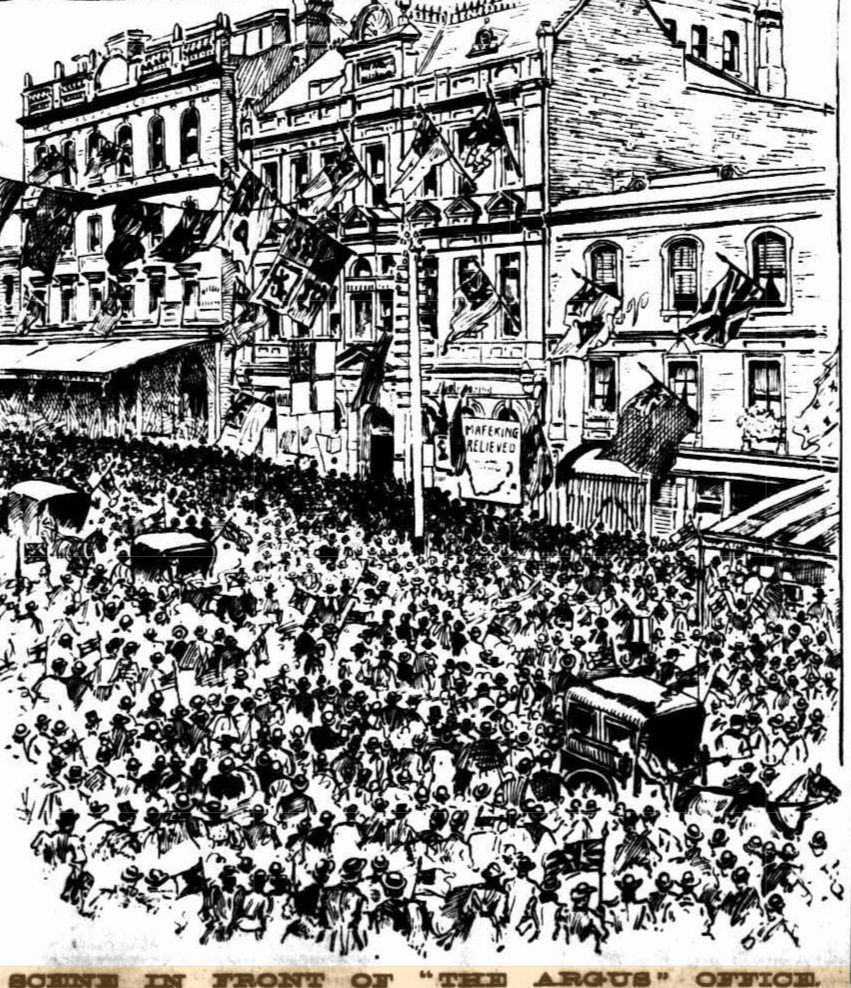 SCENE IN FRONT OF "THE ARGUS" OFFICE. MAFEKING DAY (1900, May 21). The Argus (Melbourne, Vic. : 1848 - 1957), p. 7. Retrieved from http://nla.gov.au/nla.news-article9541836