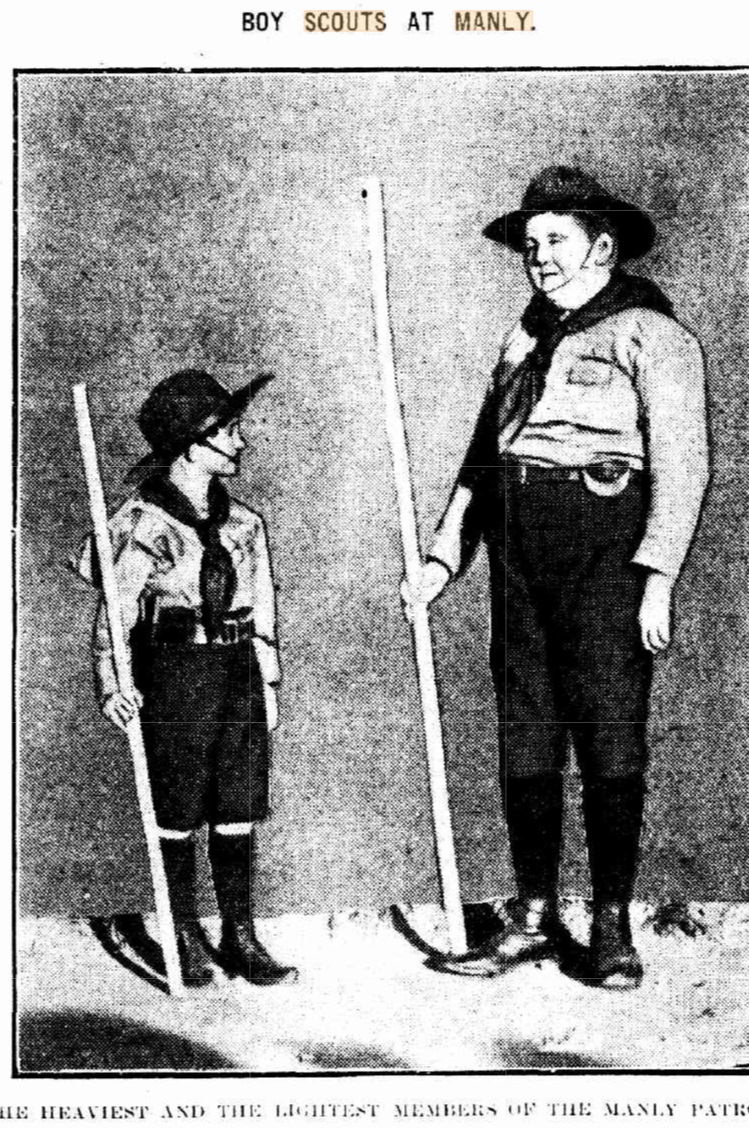 THE HEAVIEST AND THE LIGHTEST MEMBERS OF THE MANLY PATROL BOY SCOUTS AT MANLY. (1909, June 28). The Daily Telegraph (Sydney, NSW : 1883 - 1930), p. 9. Retrieved from http://nla.gov.au/nla.news-article238287523