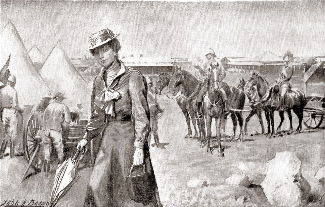 Drawing of Lady Sarah Wilson in South Africa during the Second Boer War, published in The Black and White Budget Transvaal Special No 8. Caption reads "A brave woman. Lady Sarah Wilson, who is acting both as nurse and correspondent at Mafeking".