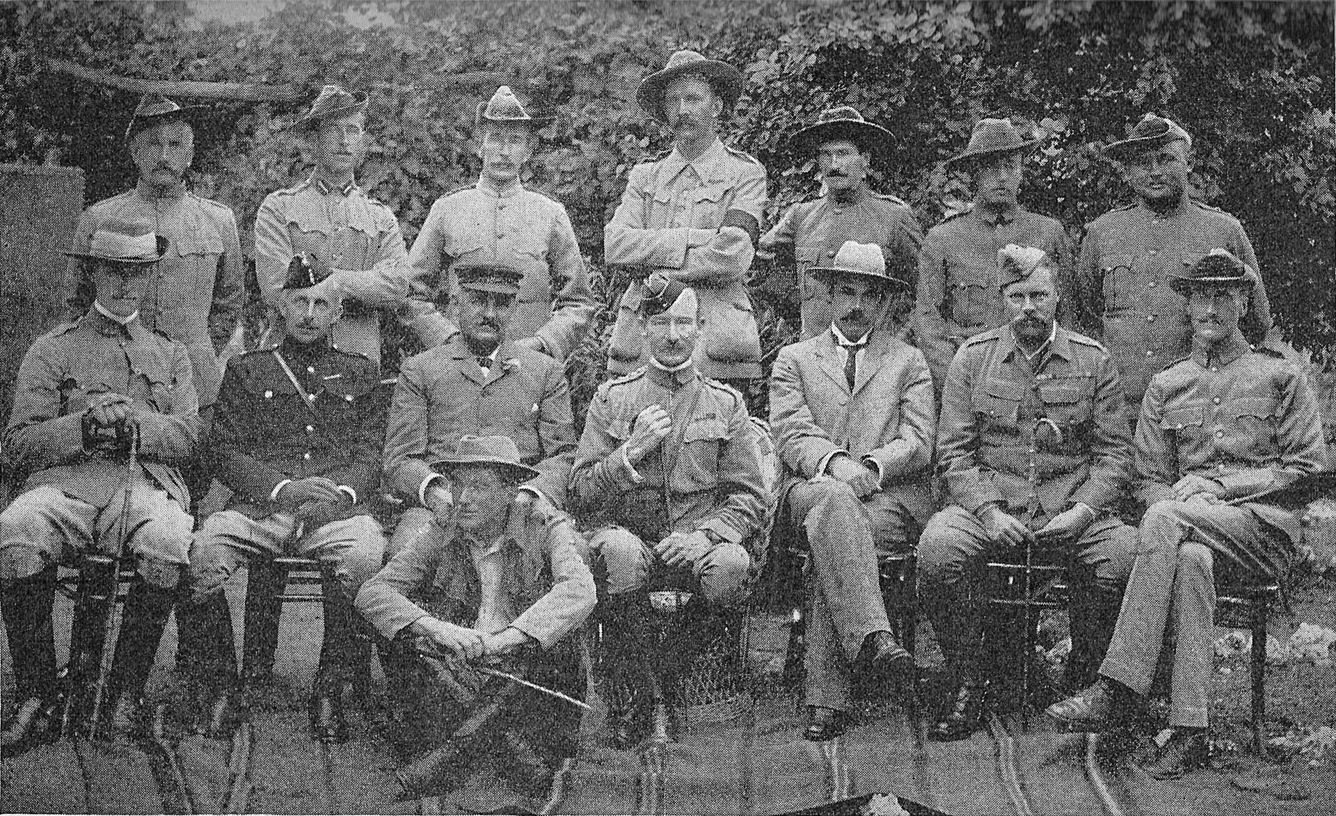 Photograph: Robert Baden-Powell and his staff after the Siege of Mafeking in South Africa, published in The Black and White Budget Vol 3 No 35, page 297. Main caption reads "Major-General Baden Powell and the principal men who helped him to defend Mafeking". Photo by J. Angus Hamilton, Our Special Correspondent with Major-General Baden-Powell.