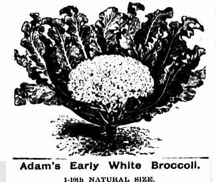 Adam's early, white broccoli.-This is a vigorous growing variety, with rather numerous longstiff, glaucous-green leaves. The head is white, very compact and hard, continuing firm for a longtime.. It is a hardy, easily grown, early variety.