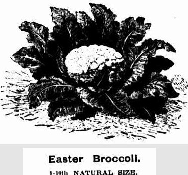 Easter broccoli.-This is a very handsome, early, and distinct variety. Its leaves are not so numerous as those of most other kinds of broccoli, and have a very peculiar appearance, being rather short, and nearly triangular in shape. It is one of the best kinds, and forms a very regular head, but is rather tender.