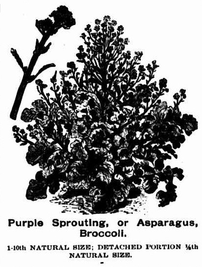Purple sprouting, or asparagus broccoli.-Under this name different varieties have been cultivated; that which is now most commonly grown has both the stems and leaves of a purplish color. It produces not only in the heart but also in the axils of the leaves rather thick and fleshy, purplish shoots. These shoots are produced in succession for a long time, they are gathered as they lengthen, before the flowers open, and are used like green asparagus, from which circum-stance the plant has received the name of asparagus brocoli. In England it is estimated that there are forty different forms of sprouting broccoli grown. The illustrations and part of the three descriptions of same are after Vilmorin.
