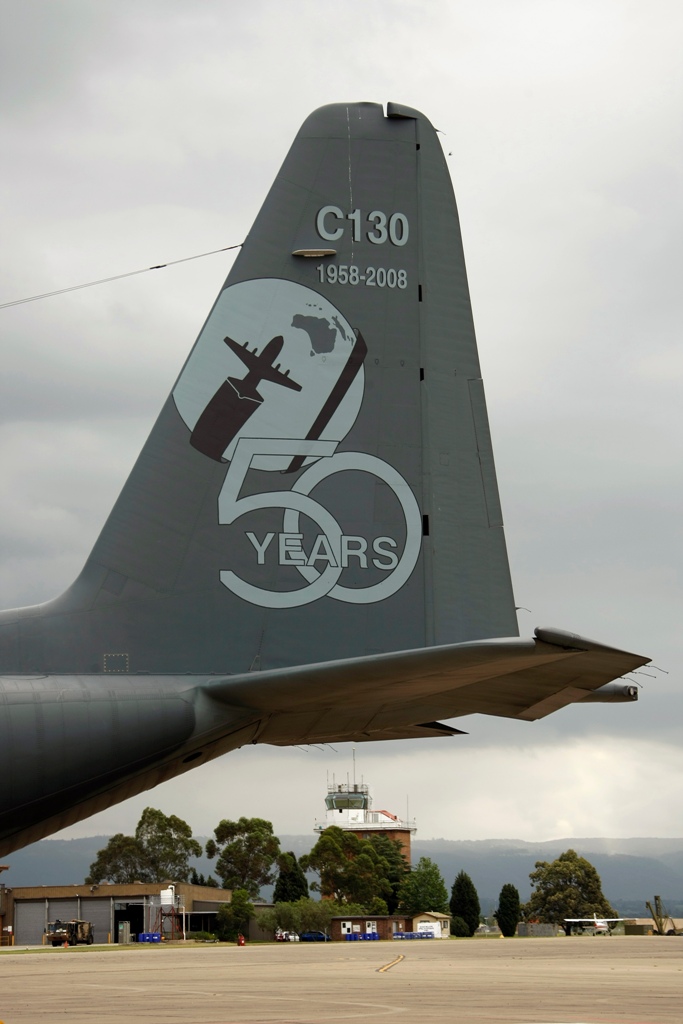Photo: A C-130H Hercules on the flightline at RAAF Base Richmond displays the commemorative tail marking 50 years of C-130 Hercules service with the Royal Australian Air Force. Photo by LAC Christopher Dickson. © Commonwealth of Australia and RAAF.